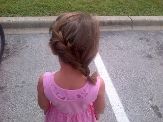 After we left Chuck E Cheese we headed to the grocery to get a few ingredients to make a cake. We mixed it and through it in the oven quickly. We got it out just in time to get her hair cut. I took her to the salon I have been going to, Tangled. We met Alysha and Kaylea loved her. Since she cut Kaylea's hair dry, she asked if she could braid it. Kaylea let her and it looked super cute. The best part - she only charged $10.